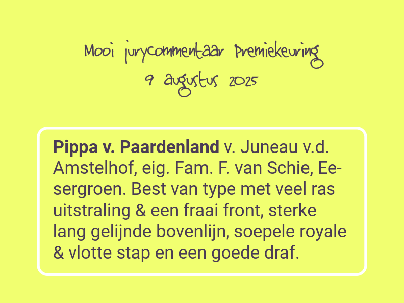 Als 4-jarige kwam Pippa op kop te lopen in haar rubriek op onze premiekeuring (2025). Ze ontving een 1e premie! Ze mocht net als haar halfzus Pilou later op die dag meedoen aan het kampioenschap van de middenmaat. De jury koos voor Pilou.